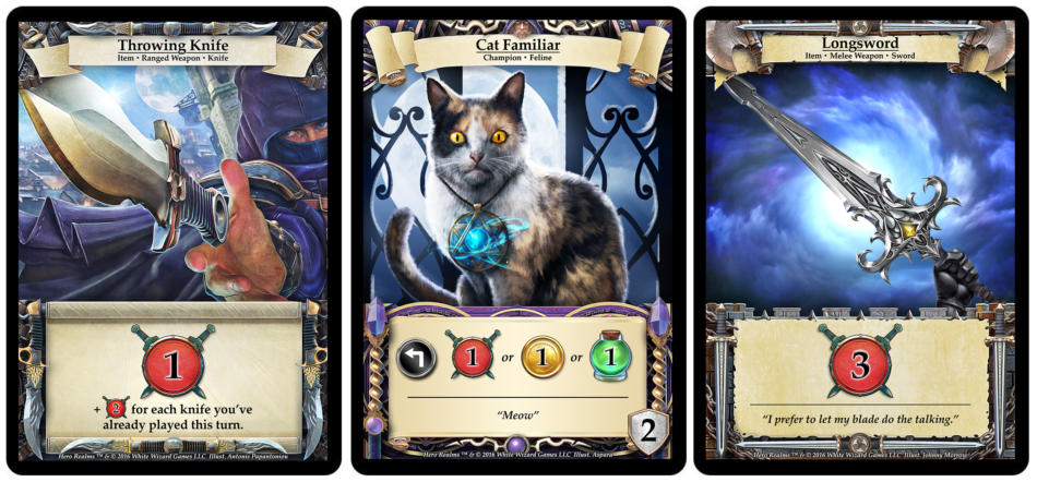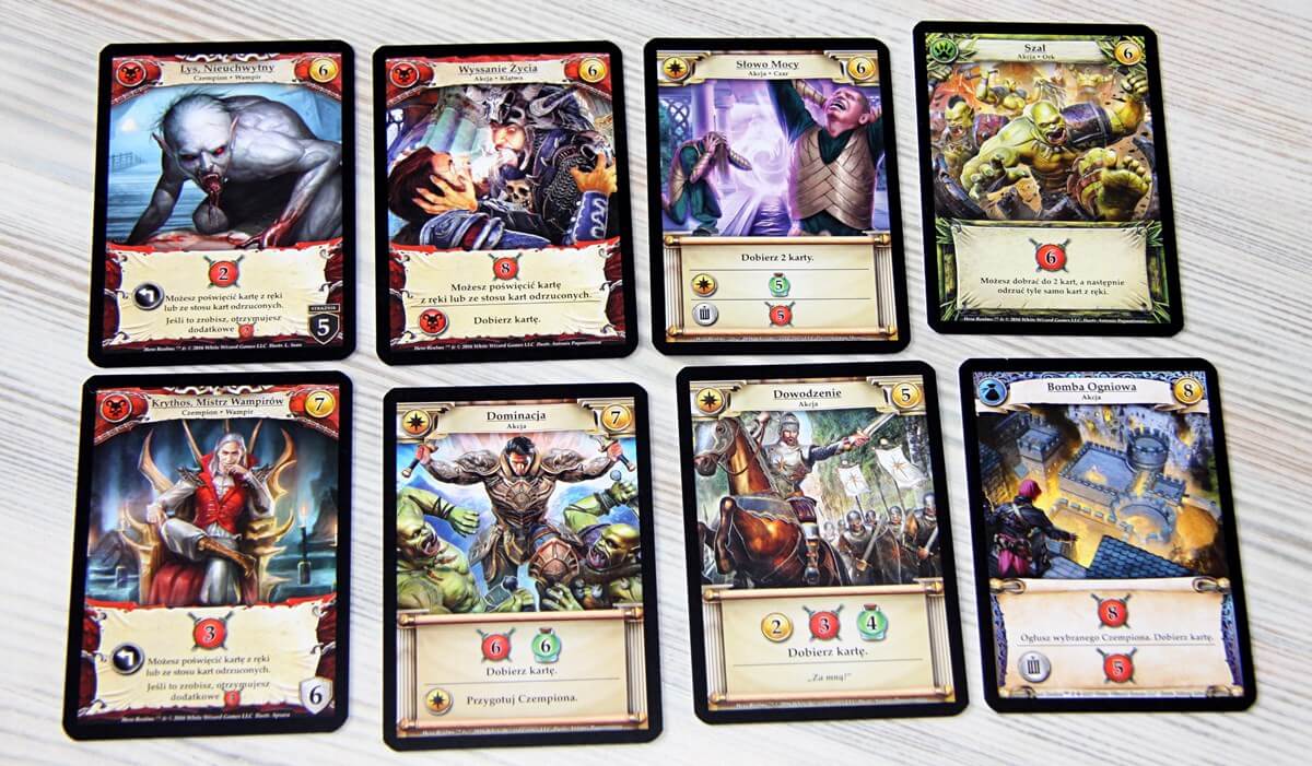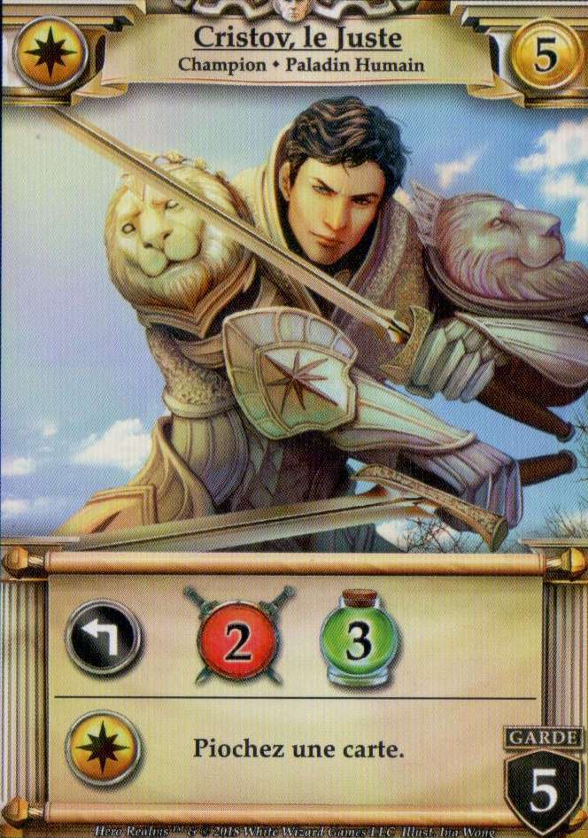 Avec la sortie de Heros Realms, 5 decks de Héros sont disponibles, et c’est assez intéressant, puisque chaque héro a son propre deck, sa propre spécialité, ses propres armes, bref 5 manières de jouer totalement différentes, et ça c’est plus intéressant.