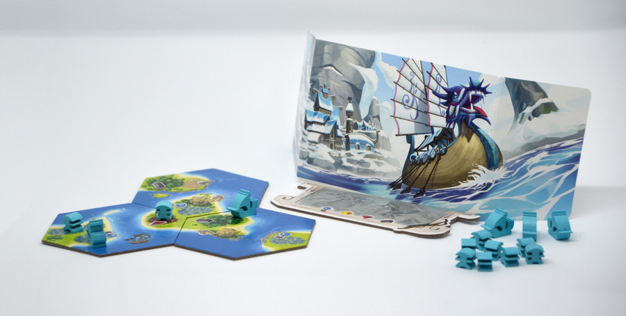 Pour ce nouveau jeu, La Boite de Jeu s’est offert les services de Paul Mafayon, qui n’en est pas à son coup d’essai puisqu’il a illustré récemment des jeux comme Bunny Kingdom, Otys et Arena : for the Gods, ce qui a pour effet d’avoir des illustrations qui claquent, c’est coloré c’est beau bref ça donne envie. Ensuite le matériel est de très bonne qualité, et est en quantité, nous avons 90 cartes action, 8 paravents aux illustrations différentes, 15 meeples navire et pionniers pour chaque joueur, 20 tuiles de terrain bien épaisses et plus de 150 jetons ressource. Donc oui pas mal de matériel dans cette petite boite.