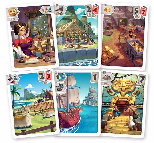 - Actions (optionnel) : vous avez des cartes en main, et ces cartes vont vous permettre de réaliser des actions. Tout se base sur le sacrifice puisque pour faire l’action d’une carte vous allez devoir défausser un certain nombre de carte. Du coup plus vous avez de cartes en main, plus vous pouvez faire d’action. Le nombre de cartes à défausser est indiqué en haut à droite de votre carte, et l’action en haut à gauche. Avec vos cartes vous pourrez ajouter ou déplacer un navire, débarquer un pionnier sur une ile ou un de vos bateau est accosté pour récolter des ressources plus ou moins prestigieuses, construire des bâtiments …
