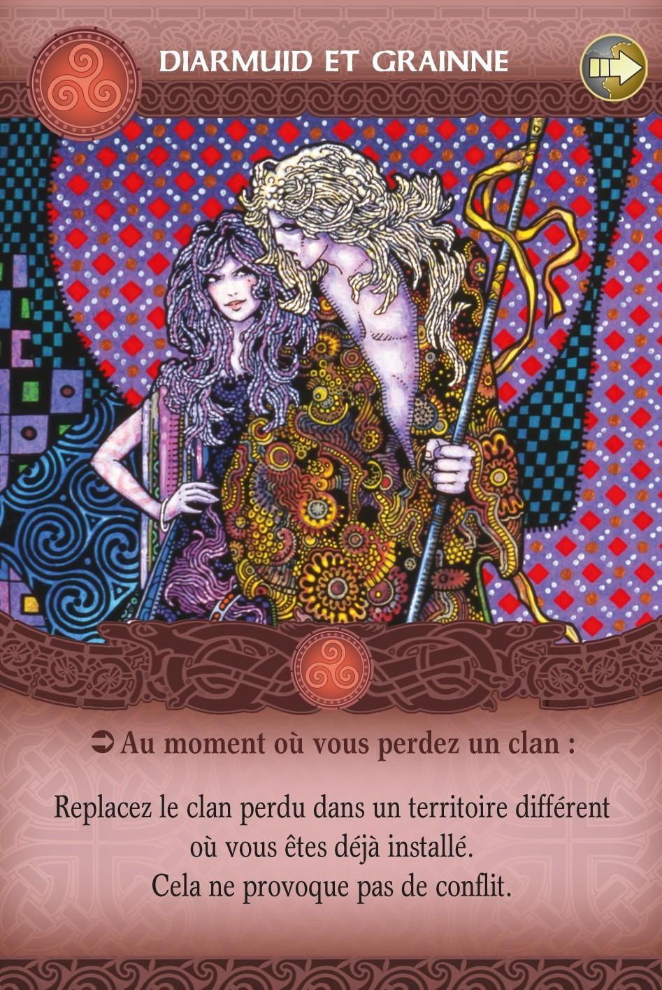 Ce qui saute tout de suite aux yeux c’est les illustrations qui sont juste absolument magnifique, le style, les couleurs, tout y est, les symboles Celtes, c’est donc du très boulot, que ce soit sur les tuiles, les cartes et c’est Jim Fitzpatrick et Dimitri Bielak qui s’y sont collés. Pour ce qui est du contenu, nous avons 67 cartes, 18 bâtiments en plastique, 48 figurines de clan, 16 tuiles de territoire, des marqueurs, et le tout est de très très bonne qualité.