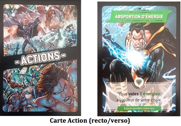 Juste League est un jeu de cartes, donc forcement on a 25 cartes de super héros, 25 cartes de vilains, 90 cartes action et 40 cartes évènements, 4 dés et des pions énergie et points de vie. Les illustrations du jeu sont juste magnifiques, et sont tirées des comics, donc pour les connaisseurs vous retrouverez des illustrations célèbres de vos super héros favoris.