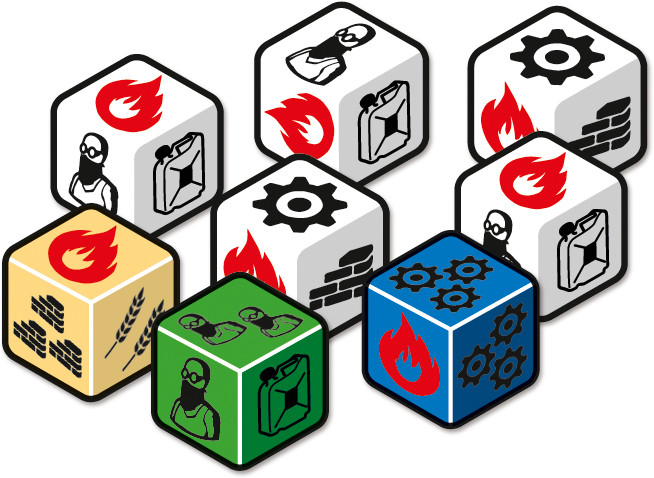 - Choisir et lancer ses dés : de base vous lancez les 5 dés blanc, et pour un jerrican vous pouvez prendre 1 dé spécial supplémentaire. Avant de lancer vos dés, il faut bien regarder les cartes, et voir ce dont vous avez besoin comme ressources pour acquérir la carte en question. Car oui sur les dés il y a des symboles de ressources, il y a la brique, le blé, le métal, les recrues, le jerrican, et le feu qui ne rapporte rien. Lorsque vous êtes prêt, et que vous savez ce que vous voulez, vous retournez votre citerne et vous lancez vos dés, il va falloir être rapide, prendre des décisions vous ne voulez pas vous retrouver sans KERO.