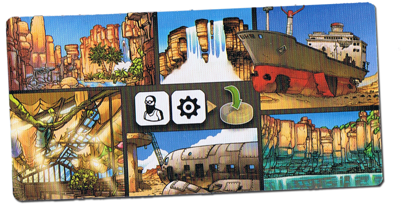 La mise en place est plutôt rapide, on place le plateau entre les 2 joueurs, (car oui c’est un jeu à 2), on place les tuiles, chaque joueur prend son camion, ses explorateurs, 2 pions jerrican, il y a juste le paquet de carte à préparer, c’est assez rapide, je vous passes les détails.