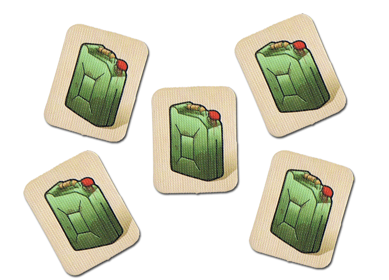 - Faire le plein de KERO : c’est une étape obligatoire durant une partie de KERO (mais pas obligatoire à chaque tour), faire le plein, car vous le verrez plus tard, le KERO c’est un peu la vie. Pour faire le plein, il faudra dépenser 1 jerrican, le joueur adverse prendra les 8 dés, et au moment ou vous retournerez votre camion, le joueur adverse lancera les dés. Dès que l’adversaire fait un résultat feu, il le met de coté, le but étant de faire que des feu, lorsque c’est le cas, le plein est terminé, donc ça peut aller vite ou pas.
