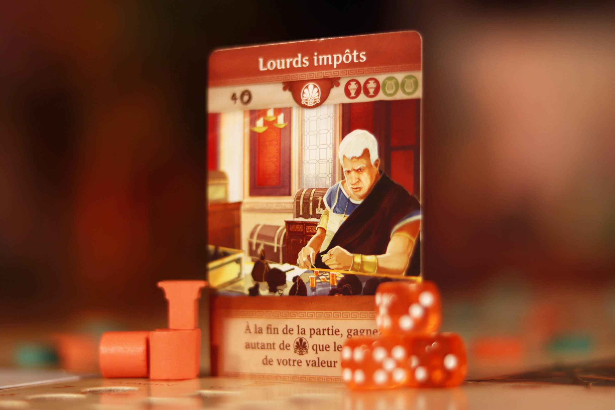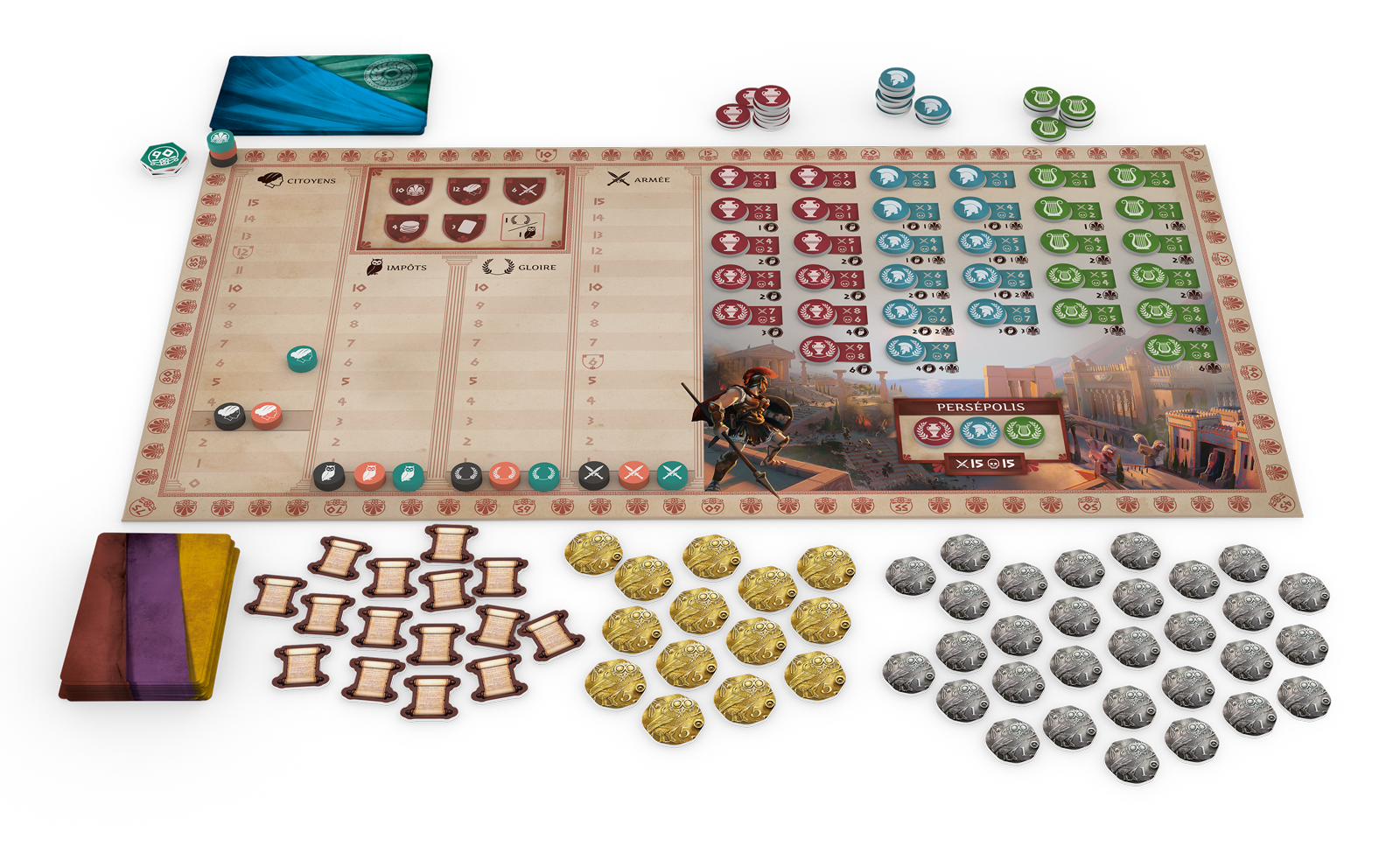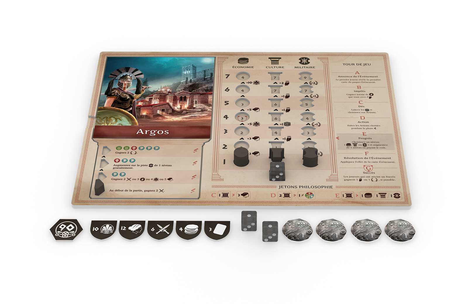 Dans cette belle boite on trouve 4 plateaux citée avec 7 tuiles citée différentes, 28 tuiles actions, 20 jetons succès, 36 pions en bois, 12 dés, 40 cartes politique, 16 cartes évènements, des jetons connaissance et philosophie, des pièces d’or et d’argent… donc oui pas mal de matériel à la qualité irréprochable, en général chez IELLO on ne plaisante pas avec ça. Pour ce qui est des illustrations c’est aussi très réussi et c’est David Chapoulet & Jocelyn Millet qui s’y sont collés.