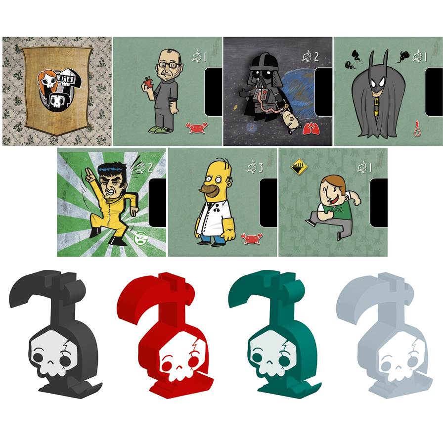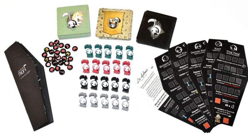 Le jeu La petite Mort se présente dans une petite boite en forme de cercueil, l’idée est très bonne, même si elle est peu original, le thème force un peu les choses, mais c’est suffisamment cool pour le souligner. La boite est sobre, un cercueil noir, avec un dessin de la petite mort dessus, c’est classe. Pour ce qui est du contenu, vous avez 133 cartes de format carré, 9 diplômes (scenario), 20 meeples Petite Mort sculptés qui sont super beau et 21 jeton « Death Powa », tout est de bonne qualité. Ai-je besoin de parler des illustrations ? Ok j’en parle quand même, donc oui c’est Davy Mourier qui a fait les illustrations, et elles sont excellentes, on y trouve des personnages connu tels que Coluche, le Terminator, Gainsbourg, Link, Bob l’Éponge, Kurt Cobain … Tout ça avec le trait particulier et plein d’humour de Davy.