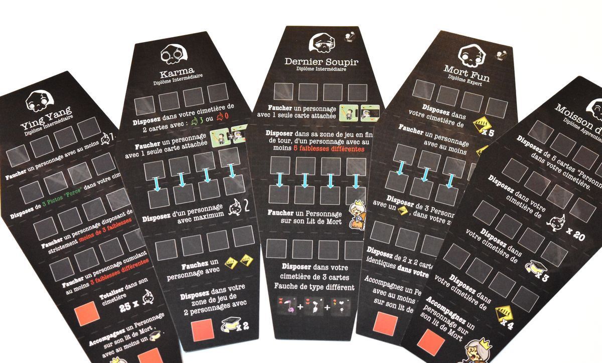 Comment on gagne ? Tout dépend du scenario, chaque scenario propose une série d’objectifs à atteindre, des que vous remplissez un objectif, vous placez une Petite Mort dessus, et si vous avez placé 4 Petite Mort et bien vous gagnez la partie.