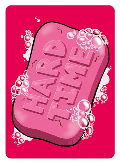 Lâches pas la savonnette c’est une petite boite, rose, l’illustration de la boite nous donne toutes les informations qu’il faut, une savonnette, un détenu sur la savonnette, on imagine aisément de quoi il s’agit. A l’intérieur de la boite, une petite boite de savon, avec à l’intérieur 59 cartes, et le fond de la boite illustre le fond d’une douche. Les cartes sont de très bonne qualité, et les illustrations sont excellentes, de très mauvais gout, mais excellentes, mention spéciale pour les cartes savonnette !! Sur chaque carte, une citation de film culte, ma citation préférée reste celle d’une des carte avocat tirée du film Doberman : « Tu voulais que je sois avocat, maman ? Ben tu vois c’est a moitié réussi, je suis déjà un enculé ».