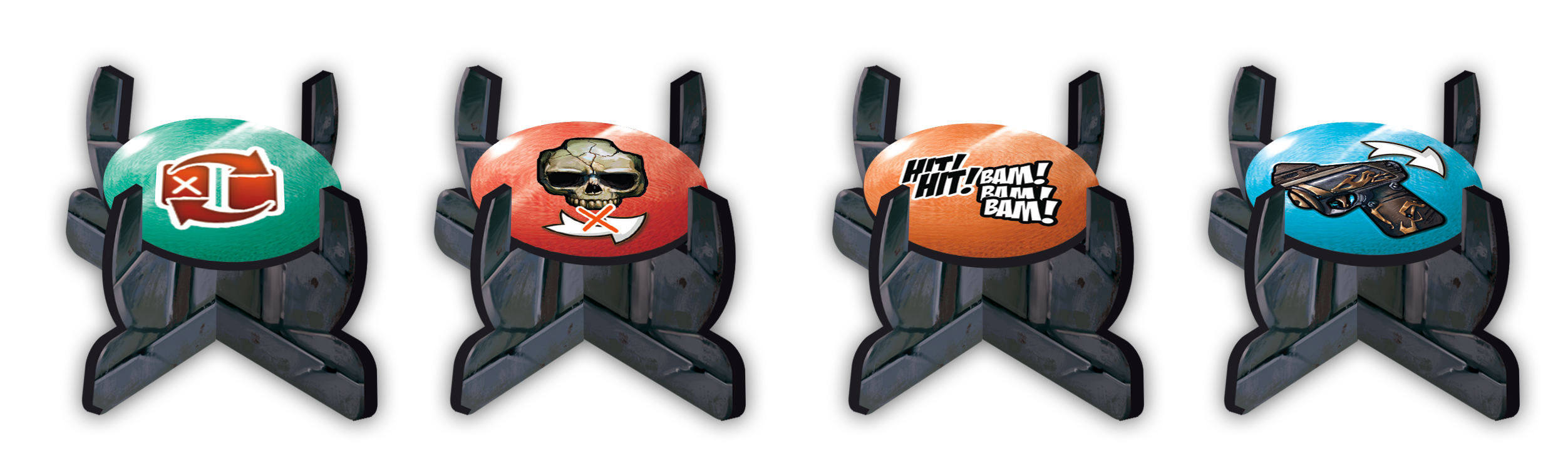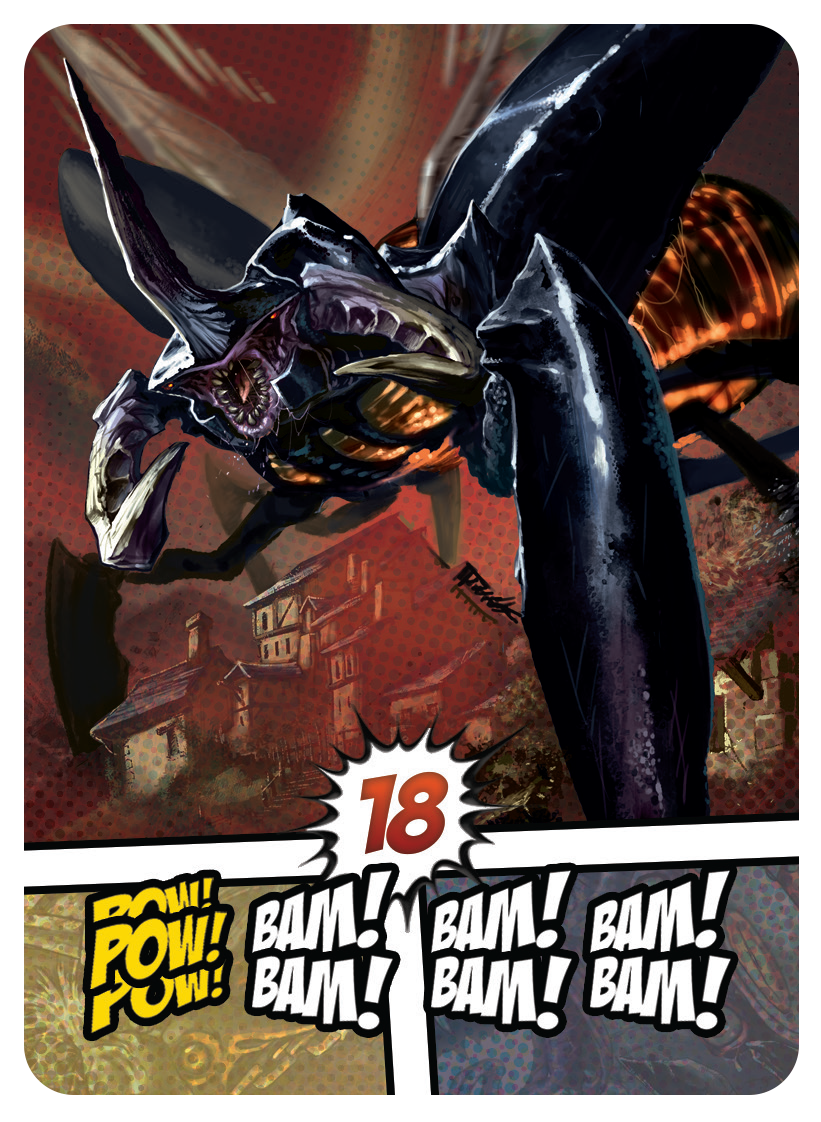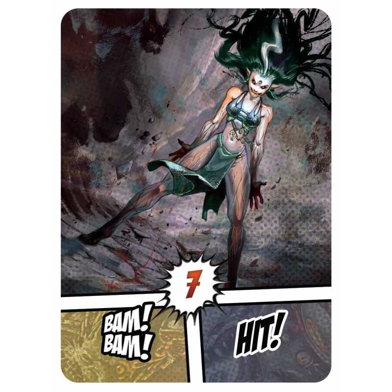Attaquer un monstre est facultatif, mais nécessaire pour gagner la partie. Les cartes ont 3 niveaux, les Hit !, les Bam Bam ! et les Pow Pow Pow !, vulgairement on peut dire force 1, 2 et 3. Pour tuer un monstre il faut donc avoir une arme chargée avec le niveau de puissance que demande la carte monstre. Lorsqu’un monstre est tué, il va dans la zone de jeu du joueur qui l’a tué, et ça fera des points en fin de partie. Il y a une petite nuance dans le principe de tuer des monstres, la carte est donc retirée et forme une brèche dans la colonne qu’il occupait, le pion héro est donc placé sur le monstre du niveau supérieure, sur la zone grise de la carte. ce qui va permettre a une autre joueur, de profiter de cette brèche pour tuer une monstre d’un niveau supérieur, mais plus facilement. Donc oui c’est vache, ça fait couiner une peu, mais c’est comme ça.