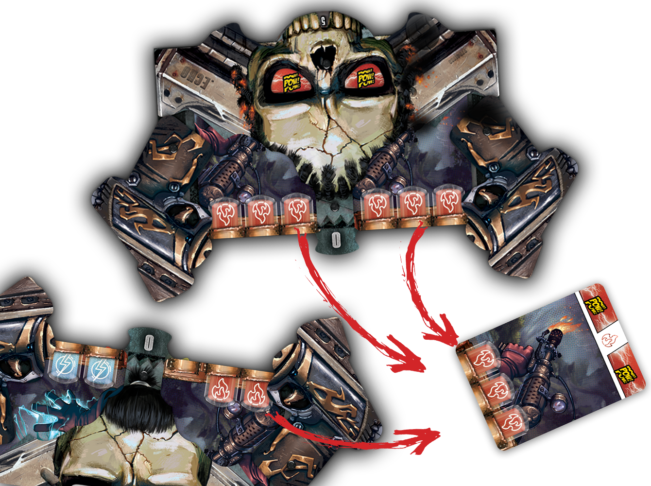 A la fin du tour, si vous n’avez plus de munitions dans l’un de vos chargeur et bien vous perdez un point de victoire, et si votre héro était sur une carte monstre, et que vous n’avez pas tué de monstre lors du tour, et bien votre héro est replacé devant vous.