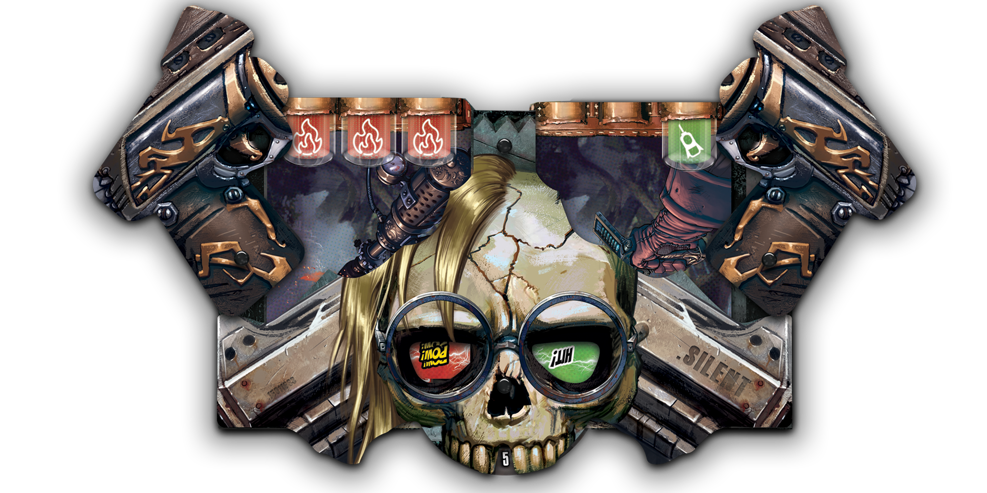Et bien ce que l’on peut dire, c’est que pour un jeu Ludonaute, c’est très surprenant, que ce soit le format de la boite ou les illustrations. La boite fait très ouvertement référence aux Comics américain, ça claque à l’œil direct, c’est beau ça envoie du bois, rien qu’à la boite on a envie de l’acheter. Il faut dire que la boite et toutes les illustrations du jeu sont de romain Gaschet, dit GeyseR dans le milieu de la BD ou il a été coloriste de Comics, illustrateur et dessinateur, donc du coup, ça déchire. Le matériel est lui aussi au rendez vous, vous avez 5 plateaux chargeur, 60 cartes arme de 5 types différents, 36 cartes monstres, 5 pions artefact et 6 jetons pouvoir, et 5 pions héros. le tout de très bonne qualité, donc rienàa redire la dessus. La règle est au format BD, du coup ça claque bien, c’est très plaisant à l’œil mais on s’aperçoit vite que c’est pas hyper lisible pour une règle de jeu, ou c’est peut être ce format un peu atypique qui fait que c’est pas simple à lire, c’est peut être une question d ‘habitude.