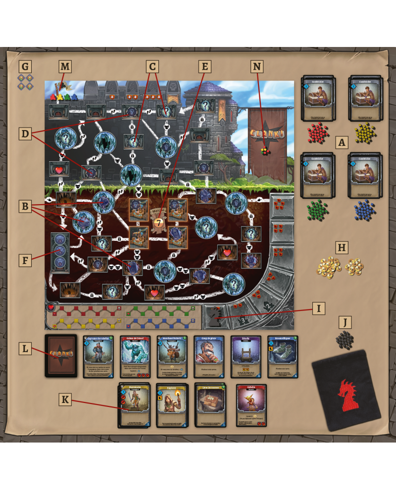 Clank ! reprend le même principe que Star Realms, avec un jeu de plateau. Les cartes vont vous permettre de vous déplacer sur le plateau, de battre des monstres, de récupérer de l’or pour acheter des trésors et de prendre des artefacts. Clank ! c’est le bruit que vous faites en vous déplacant, ou en tuant certains monstres, et plus vous faites du bruit, plus vous risquez de réveiller le Dragon.