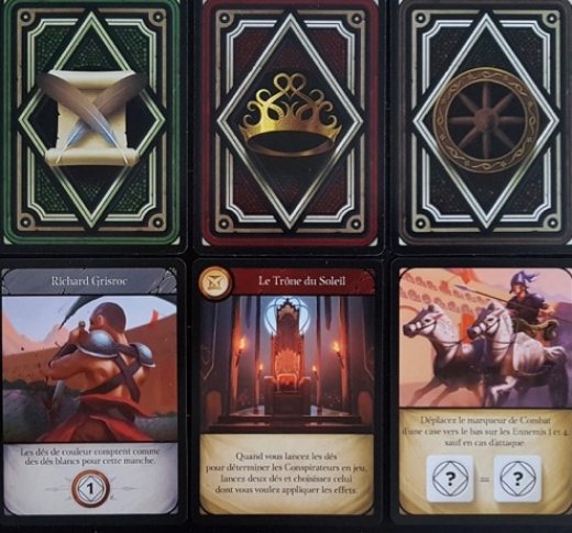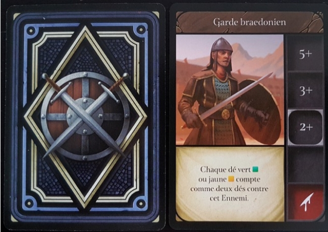 • Résoudre les attaques : autour du plateau arène il y a 6 cartes d’ennemi à combattre. Chaque carte va vous demander une valeur et une quantité de dés, afin de pouvoir blesser l’ennemi. Sur l’emplacement 1, il faut placer que des dés de valeur 1, on procède de la même manière pour les autres emplacements. Vous êtes obligé d’attribuer tout vos dés, si vous attribuez la bonne série demandée par la carte, l’ennemi subit une blessure, vous déplacez le marqueur de dégât d’une case vers le haut, et si vous atteignez la dernière case, l’ennemi est vaincu. Si vous attribuez un dé solo, le marqueur descend d’une case et vous prenez un dégât, et s’il atteint la case rouge, vous prenez un autre dégât. Si vous attribuez une série incomplète ou aucun dé, il ne se passe rien. Lorsque vous subissez une blessure, vous devez ajouter à la piste de fatigue un de vos dé.