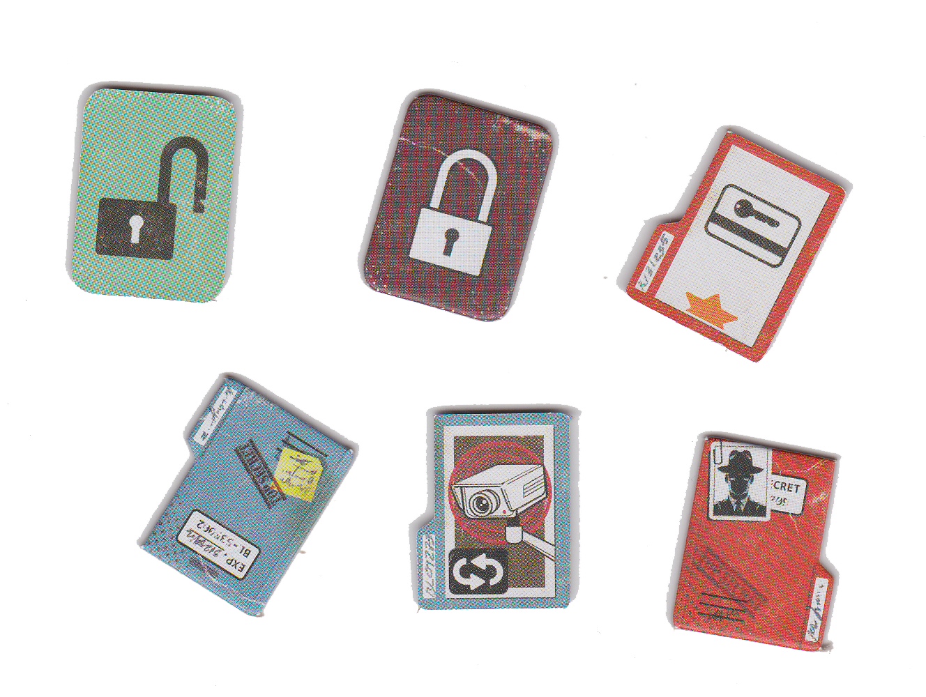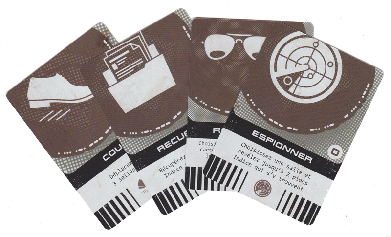 - Espionner : vous choisissez une salle et vous révélez jusqu’à 2 pions indices qui s’y trouvent, sachant bien sur que tous les pions indice sont tous face cachées au début du jeu.