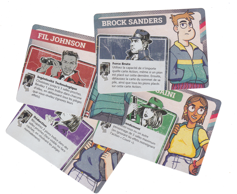 Donc comme ça ça a l’air simple, il suffit de se déplacer, de révéler des indices, de les récupérer sauf que vous pouvez tomber sur les pièges qui ont souvent pour effet défausser des cartes ou bien encore de bloquer une action. Le gros problème dans le jeu, c’est la défausse car lorsque la pioche est vide, on re-mélange le tout et on y insère les cartes « temps », et quand vous devez piocher des cartes et que vous piochez des cartes temps, si vous révélez 3 symboles temps, la partie est perdue !