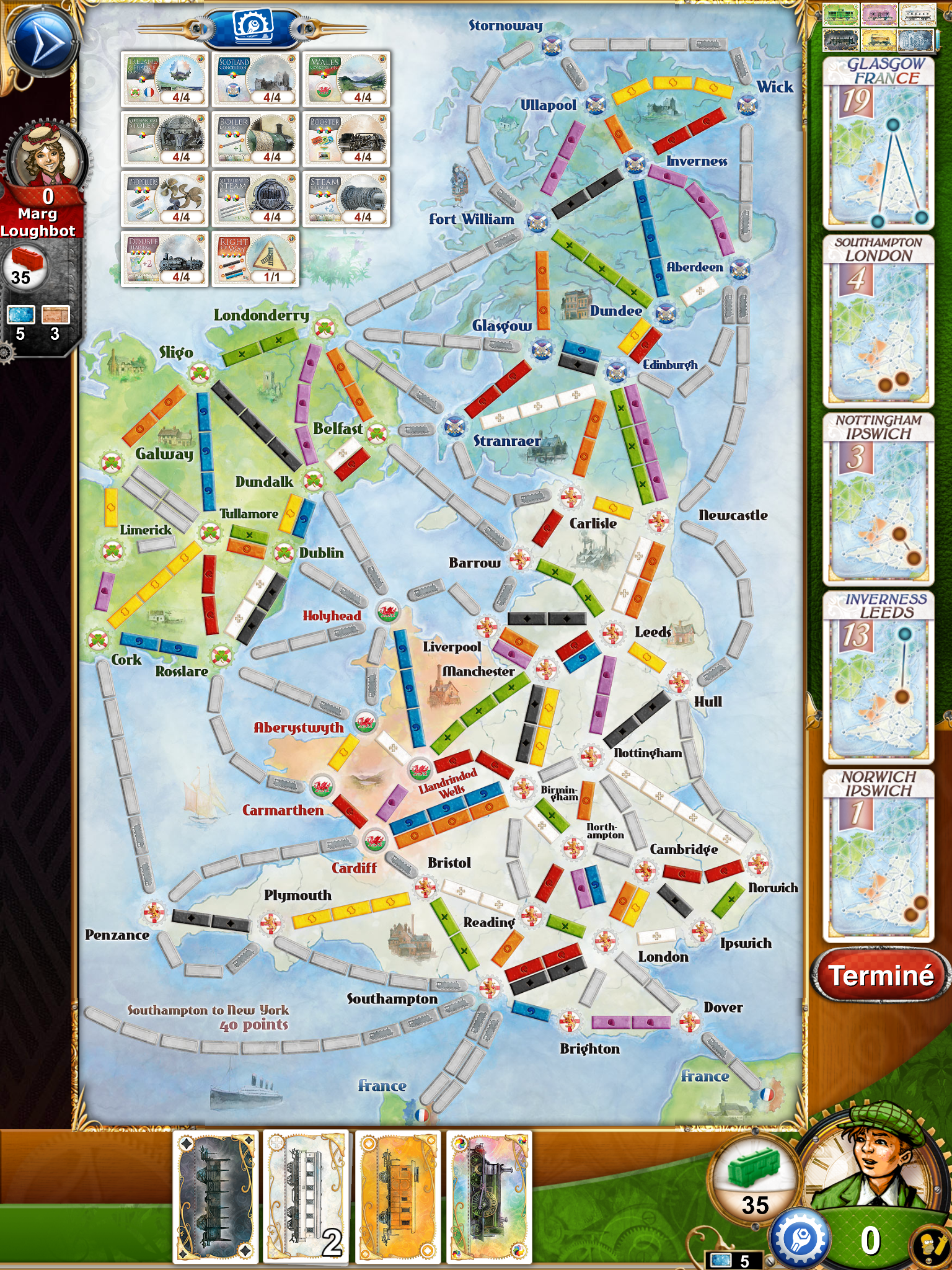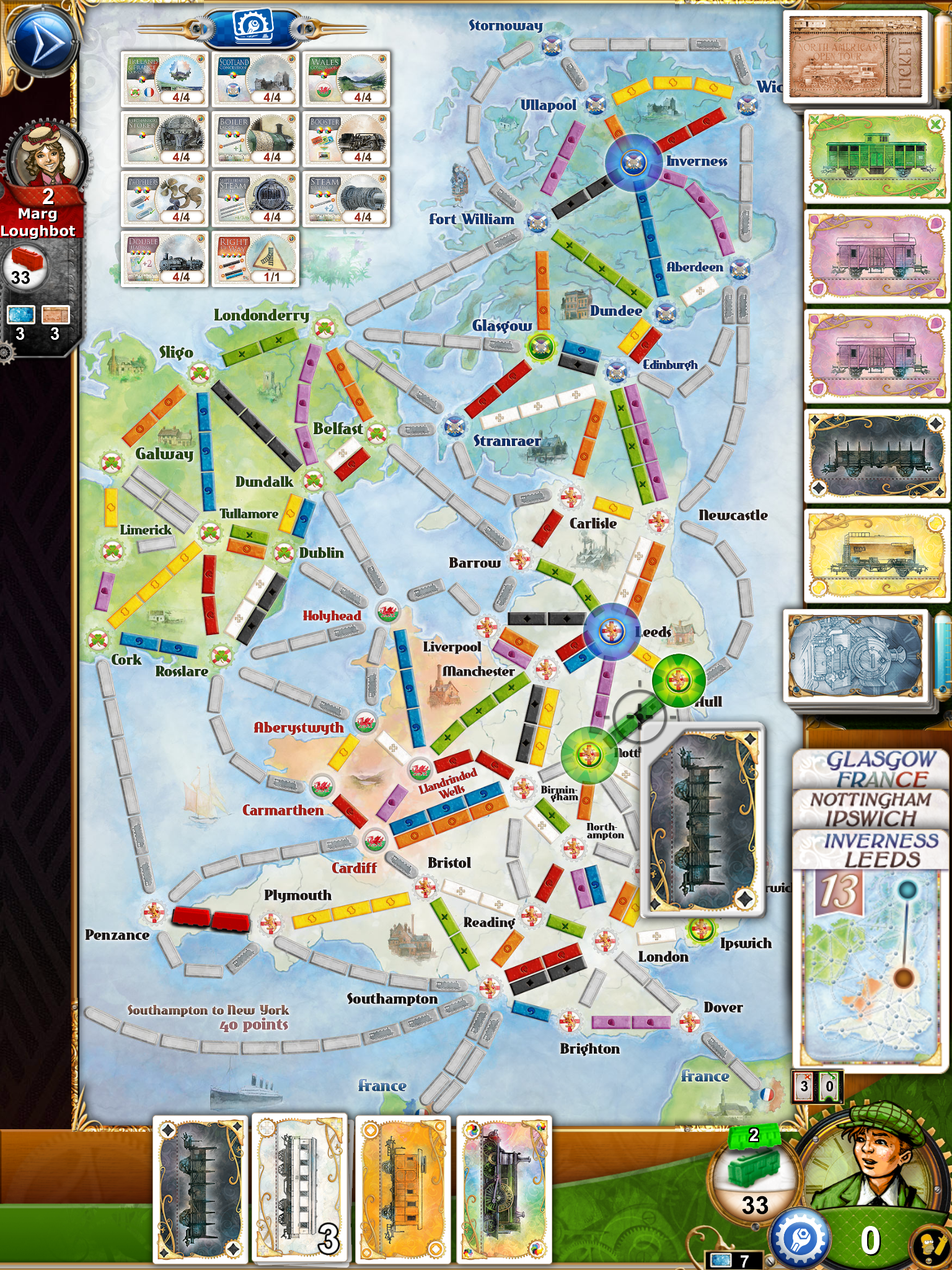 La configuration du plateau est clairement différente, le plateau se place en format portrait, les routes sont plutôt courtes, et on peut passer par la mer. Sur ce nouveau plateau il est possible d’utiliser des ferries, et pour cela il faut absolument y placer le nombre de locomotive indiqué sur cette route. Sur cette carte il y a donc 3 territoires, l’Angleterre, l’Irlande et l’Écosse, et pour pouvoir circuler en Irlande et en Écosse, il faudra acquérir des cartes technologie, sans ça vous ne pourrez pas accéder à ces parties du plateau. C’est la grosse nouveauté de cette extension, les cartes technologie, vous donnent accès aux différents emplacements du plateau, et vous conférent aussi des « pouvoir », des points supplémentaires, la possibilité de prendre des routes avec des couleurs de wagons qui ne correspondent pas … Ces cartes technologie ont un cout bien sur, il faudra vous défausser d’un certain nombre de locomotives pour les acquérir.