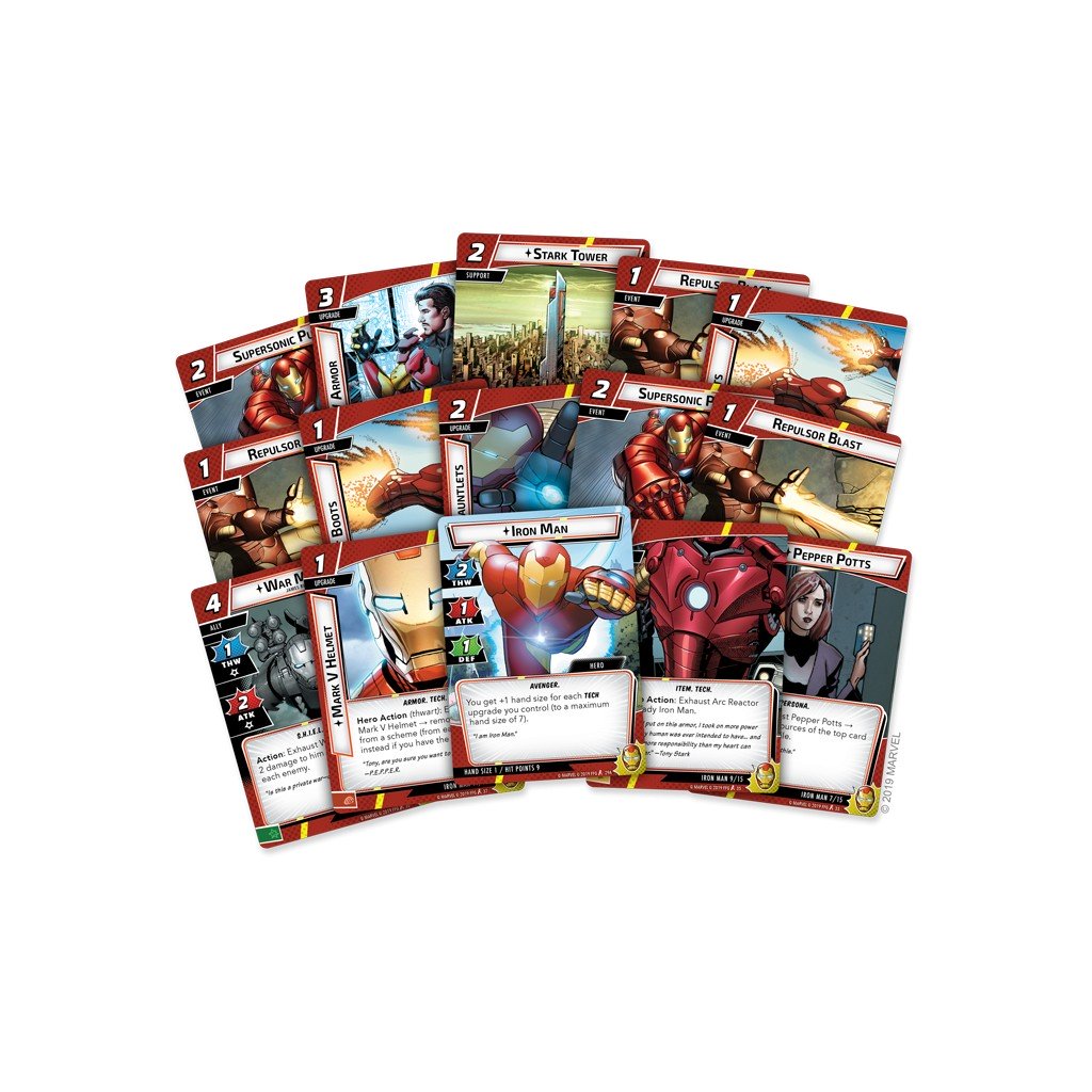 Comme Marvel Champions c’est un jeu de cartes, on y trouve essentiellement des cartes, 343 pour être précis, on y trouve également des pions, et des compteurs de point de vie, vilain et héro, et c’est tout. Alors oui c’est tout, mais tout est de très bonne qualité, petit hic, le termo est bien foutu, il y a des emplacements pour ranger les cartes, mais pas d’intercalaire, du coup c’est tout pourri. Pour ce qui est des illustrations, c’est du Marvel, donc ça pète forcement, la boite est juste trop belle, et c’est Michal Ivan qui s’y est collé, et pour le reste des cartes, j’ai pas le détail, mais tout ce que je peux vous dire, c’est que c’est très beau, c’est du Marvel quoi 😉