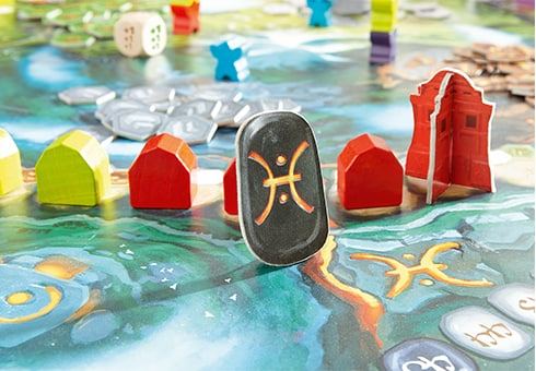 - Édifier un temple : les temples répondent aux mêmes règles que les huttes, le druide se déplace également. Les temples rapportent des points de victoire en fin de partie, selon le nombre de hutte appartenant à un colonie collé au temple.