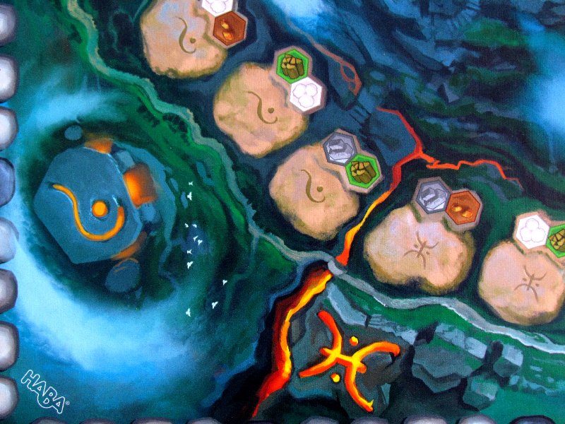 Meduris c’est déjà une belle boite, il faut dire que les illustrations de Miguel Coimbra y sont pour quelque chose. Le monsieur n’en est pas à son coup d’essai, puisqu’il est l’illustrateur de nombreux jeux tels que 7 Wonders, Cyclades, Smallworld et j’en passe, donc oui le jeu est beau. Pour ce qui est du matos, c’est du HABA, donc c’est du solide, un gros dé en bois, des meeples bien massifs, et un grand plateau recto verso, bref de la qualité en quantité.