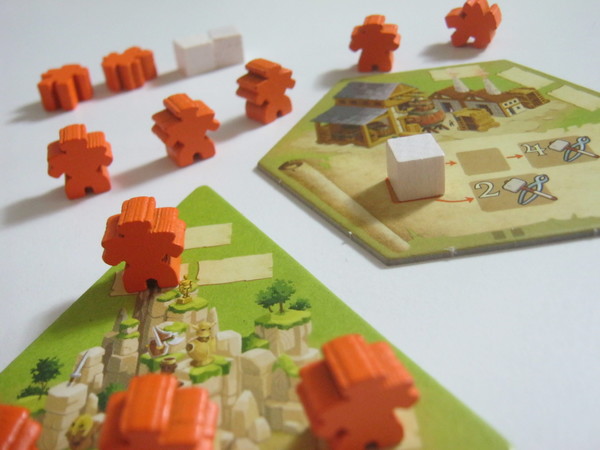Dans cette jolie boite illustré par Anne Heidsieck, une cinquantaine de Meeples, du cube en bois, et des tuiles, pleins de tuiles. Des tuiles de terrains, des bâtiments … Les tuiles ne sont pas très épaisses, donc le tout reste un peu fragile, mais pour le prix, on ne va pas faire la fine bouche.