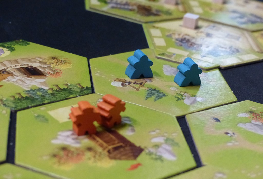 - Déplacement des Meeples sur le terrain : vos Meeples peuvent se déplacer chacun d’une case, soit sur une tuile de terrain existante, soit sur un espace vide. Il existe plein d’effet de tuile, comme les grottes qui nous permettent d’avancer d’une case supplémentaire, l’Autel des dieux anciens qui permet de sacrifier un de vos Meeples pour tuer un Meeple adverse …