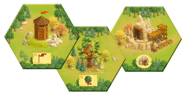 - Gain de bonus des terrains : lors des explorations, des terrains vont être découvert, et certains donneront des bonus, qui pourront être activé le tour suivant, seulement si 2 de nos Meeples occupent cette tuile.