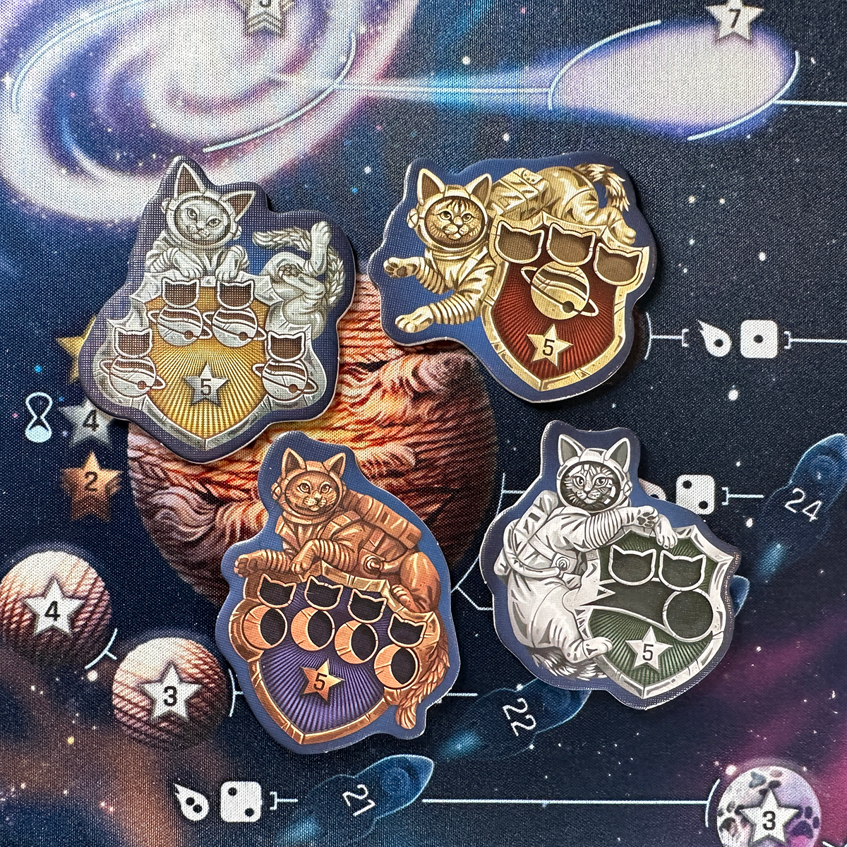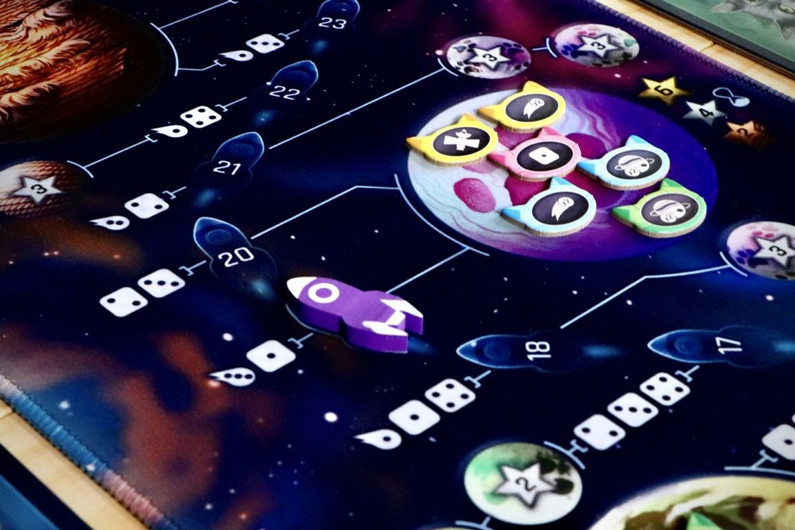 Avant de décoller, chaque joueur va prendre un plateau joueur et les pions chat à sa couleur, il y en a 8, chacun a un pouvoir mais ça je vous l’expliquerai plus tard. On place le plateau de jeu au centre de la table, les pions points de victoire à proximité, le premier joueur prend la navette et les 6 dés, et c’est parti pour un voyage spatial.
