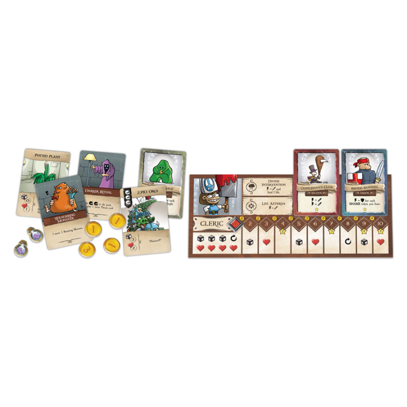 - Résoudre la baston : si vous êtes dans une salle avec au moins un monstre, il faut bien sur essayer de lui casser la tête, et pour cela il faut lancer des dés. Les dés indique des touches, des boucliers pour se défendre, et des éclairs pour activer des pouvoirs. Les dés du héros et ceux du monstre sont lancé en même temps, et le combat est donc résolu de la même manière, en même temps. Si le monstre n’est pas tué du premier coup, c’est mort il ne prend pas de blessure. Par contre si vous mourez, vous prenez un jeton honte, et vous retournez à l’entrée du Donjon.