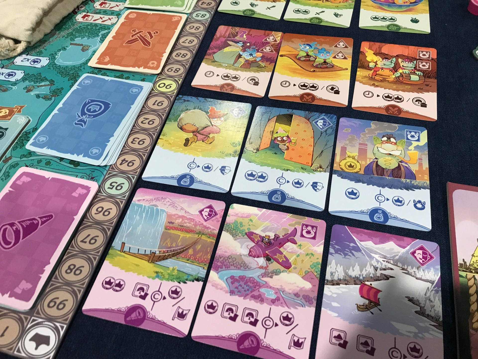 Navoria combine plusieurs mécaniques de jeu, on a du draft, de la construction de moteur de jeu et du placement d’ouvriers, alors comme ça oui ça peut faire peur et surtout beaucoup pour un seul jeu, mais il n’en est rien, car Navoria est au final hyper simple. Les tours de jeu s’enchaîne très rapidement, toutes les icônes sont bien faites et on comprend tout facilement. Il va donc falloir être un peu sur tous les fronts, même si c’est pas toujours simple, mais rien n’est à négliger. Il faudra construire des refuges, avancer sur les différentes pistes, prendre des ressources, et surtout prendre des cartes de conditions de fin de partie, car on a beaucoup tendance a laisser ces cartes de coté sur les premières parties.