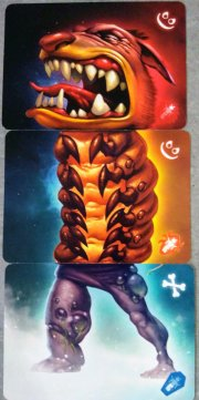 - Jouer une carte : vous jouez donc une carte de votre main, pour essayer de fabriquer votre créature, en commençant bien entendu par la partie inférieur, pour finir par la tête, sachant qu’une monstre est composé de 3 cartes. Sur les cartes il y a une icône qui indique de quelle partie du corps il s’agit, car c’est pas toujours simple de savoir.