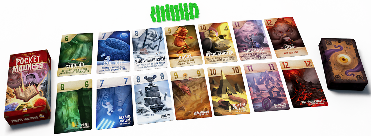 Pocket Madness propose un très bon jeu de carte, de défausse, dans l’univers de Lovecraft, avec de très belles illustrations. La review est disponible ici.