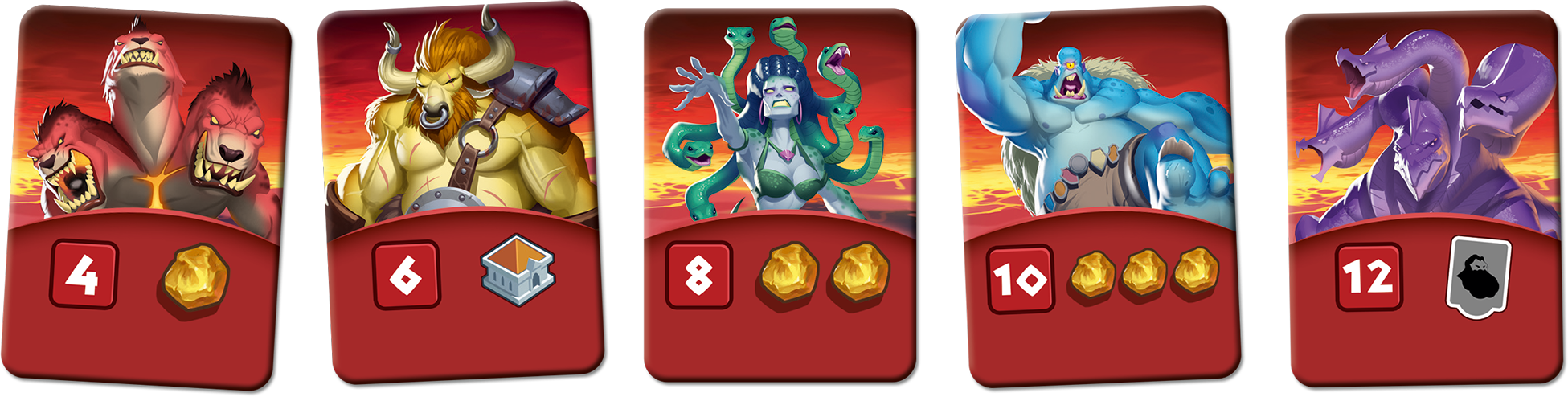 Autre manière de marquer des points c’est l’Orichalque, si vous arrivez à avoir 5 orichalques, vous pouvez avec une action de construction, forger un médaillon, et ce médaillon vaut 1 point. L’orichalque se gagne essentiellement en combattant des monstres, il faudra donc en récupérer, et choper une carte action de combat pour combattre. Pour combattre c’est simple vous avez 1 dés de combat de base, et vous pouvez utiliser des Hoplites qui mourront forcement au combat, mais qui vous donneront des dés supplémentaires, donc plus de chance de tuer le montres. Il suffira de lancer les dés et de comparer la valeur de vos dés avec la force du monstres, si c’est supérieur ou égal, vous le capturez et vous gagnez la récompense indiquée dessus.
