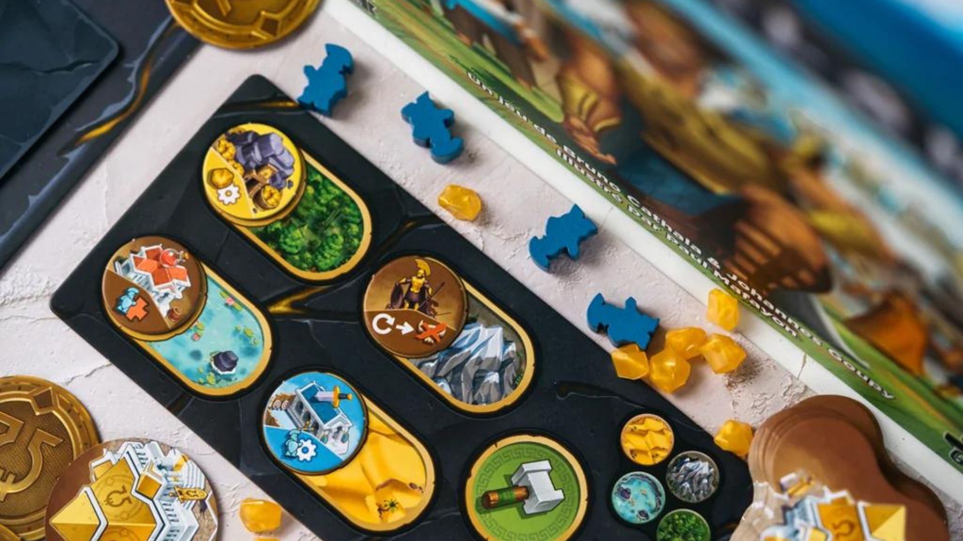 Aujourd’hui je vous présente Orichalque, le dernier jeu sorti chez Catch Up Games, la « petite » maison d’édition Lyonnaise qui monte, il est bien loin le temps de la sortie de Sapiens, leur premier jeu. Aujourd’hui c’est 17 jeux qui sont au catalogue de Catch Up Games avec des pépites comme Pharaons, The Loop, Fertility… et je pense que c’est loin d’être fini !