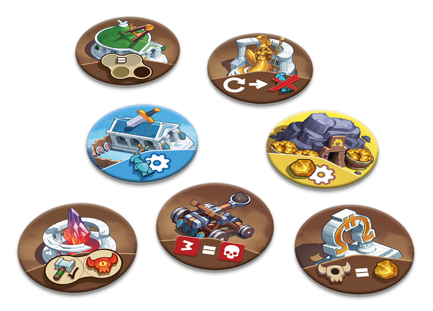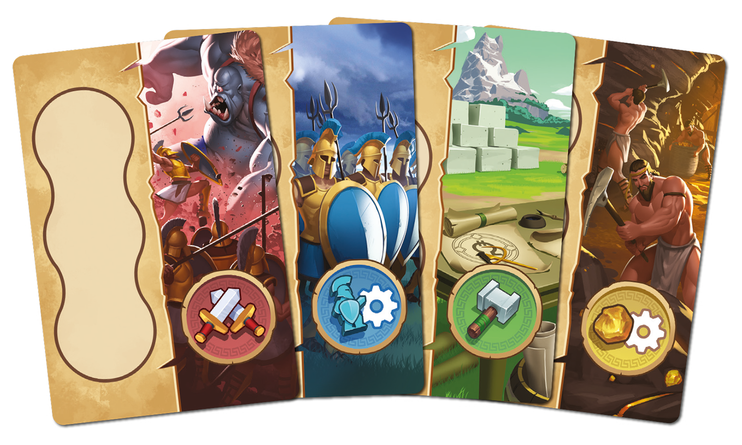 • Résoudre sa carte action : cette action est donc facultative, chaque carte action vous permet d’effectuer différentes choses comme produire de l’Orichalque, Recruter des Hoplites, combattre des créatures et construire de nouveaux bâtiments.