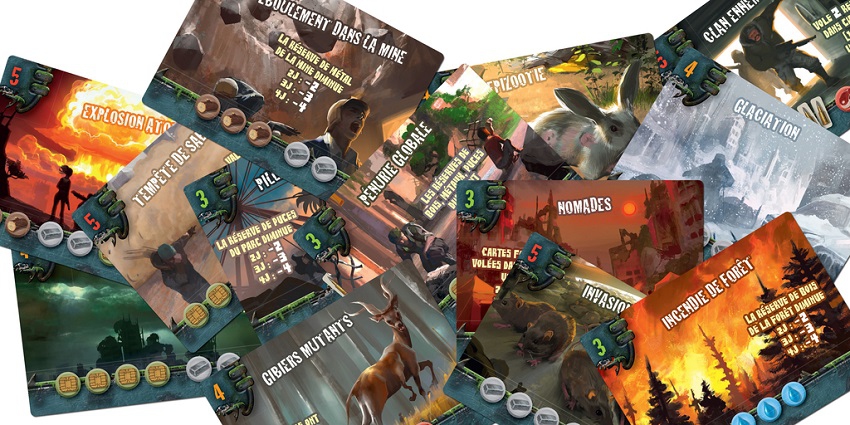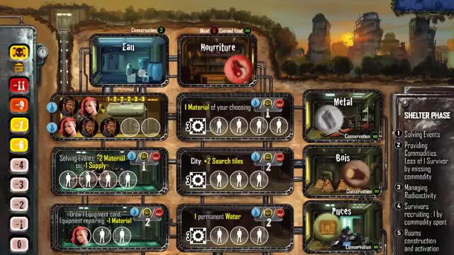 • La nuit : cette phase est surement la plus difficile, puisque durant la nuit, vous allez être enfermé dans votre abris, et il va falloir gérer pleins de choses. Vous pourrez résoudre un évènement, c’est à dire payer des ressources pour prendre la carte évènement et donc éviter que l’effet de cette carte ne l’applique le jour suivant. Car oui si on ne résout pas les évènement, et bien ils se cumulent à chaque tour. Ensuite il faudra nourrir les survivants que vous hébergez, avec de l’eau, de la viande et des conserves. Chaque survivant non nourrit quitte votre abri, ce qui peut avoir des conséquences, puisque apres il faudra gérer la radioactivité, qui accroit chaque jour. Ce sont les survivants affectés au SAS qui gèrent ça, chaque survivant présent dans le SAS réduit la radioactivité de 1. Si vous n’avez pas pu les nourrir, il quitteront le SAS et donc ne géreront pas la radioactivité. Vous pourrez ensuite recruter de nouveaux survivants, chaque denrée dépensée permet de recruter un survivant. Après ça, vous pourrez construire les salles de votre abris, car au début du jeu, elles ne sont pas construite, 3 ressources sont nécessaires pour les construire. Une salle, lorsque le nombre de survivant requis pour son fonctionnement est atteint, donne un effet à chaque tour de jeu. Tout les équipements que vous récupèrerez dans les villes seront endommagés, et c’est à ce moment là que vous pourrez les réparer en dépensant autant de ressources que demandées sur la tuile. Et pour finir chaque joueur procéde au nettoyage de son abris, en jetant tout ce qui est périssable, comme la viande, et l’eau, on ne pourra garder que 2 ressources d’eau pour le jour suivant.