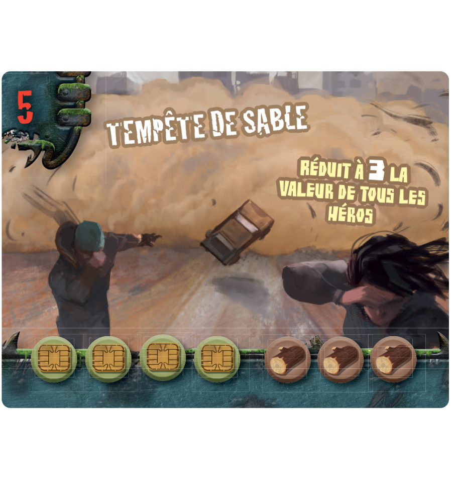 • L’aube : durant cette phase, on réalimente le plateau de jeu, en ressources, en survivant, en tuiles équipement et en tuiles fouille.