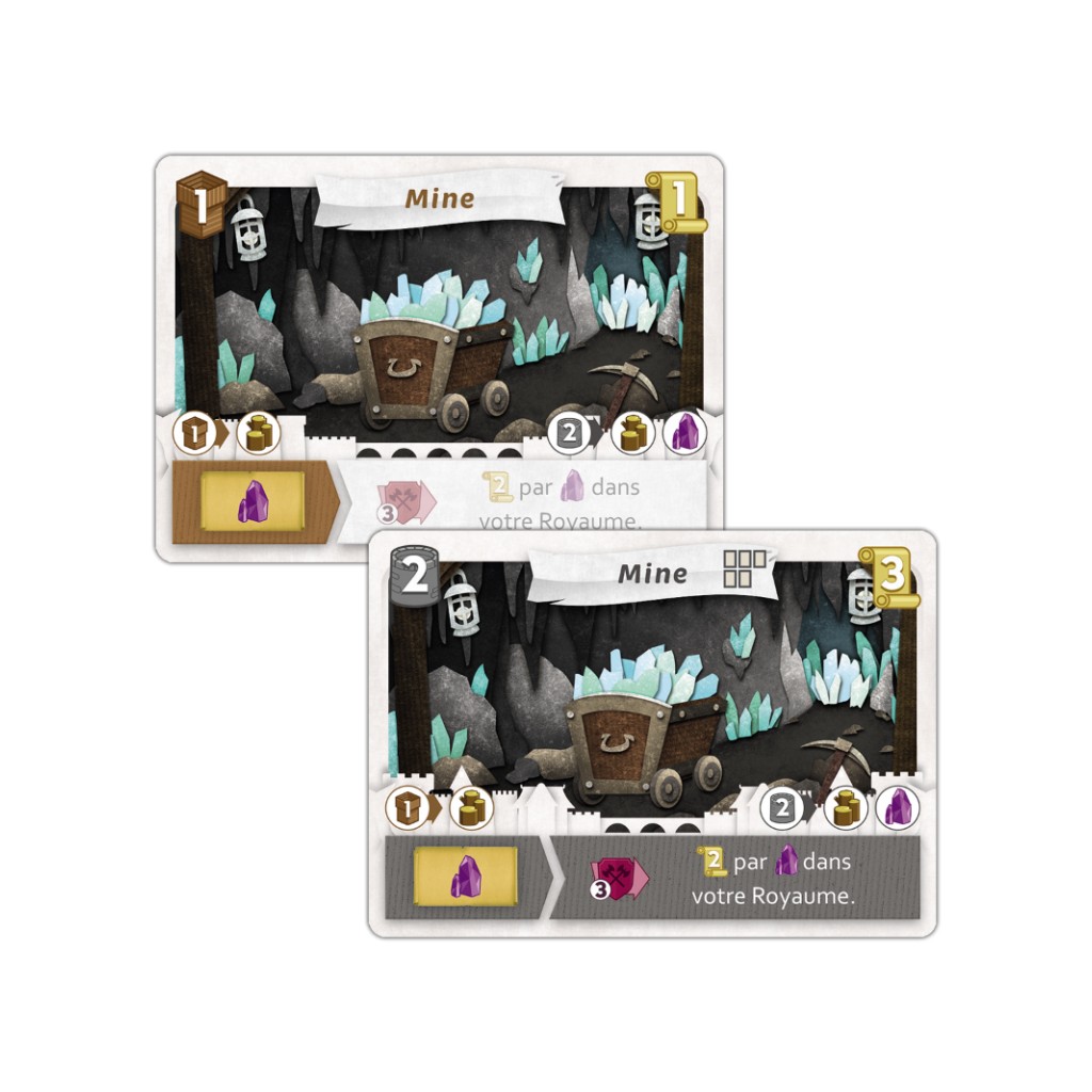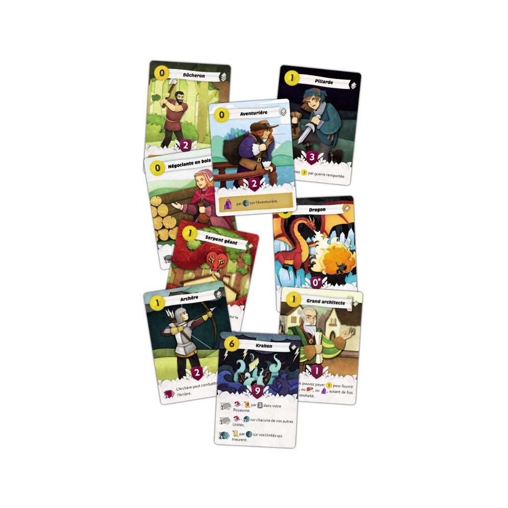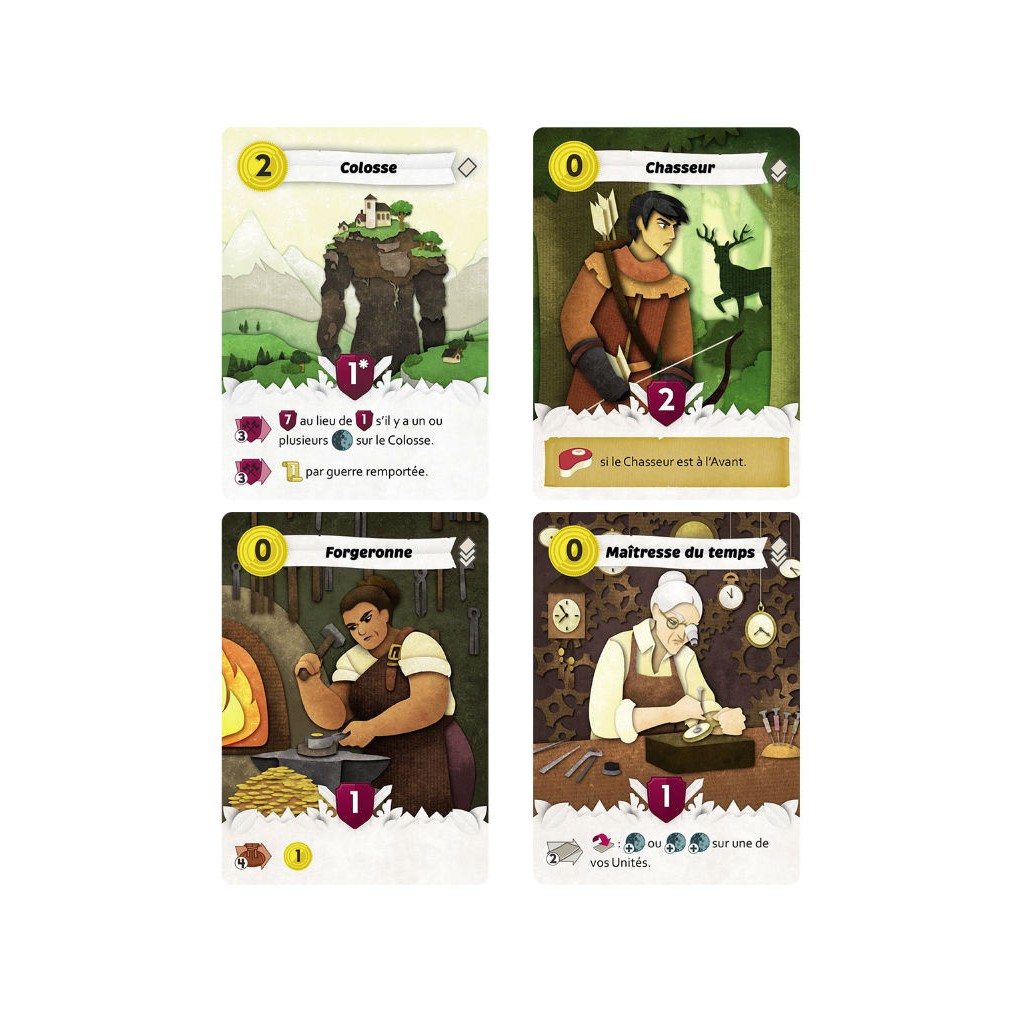 Si le plateau de score pouvait se plier en 2, la boite aurait pris 2 fois moins de place, du coup on se retrouve avec une boite pleine de vide. Alors non il n’y a pas rien dans la boite, il y a 81 cartes unité, 40 jetons argent, 30 jetons age, 25 cartes bâtiment, des marqueurs de score et une piste de score. Le matériel est de bonne qualité, et les illustrations sont très originales, pleines de poésie entre l’illustration et le dessin animé, et tout ça est signé Chrristine Alcouffe.