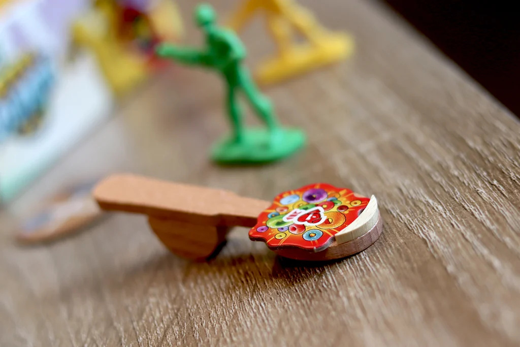 Dans cette petite boite on va trouver 10 figurines petits soldats, 1 cuillère catapulte en bois, 3 lacets de déplacement, 7 dés spéciaux, 1 pion drapeau, 74 cartes et tout plein de jetons en carton. Le tout de très bonne qualité, les figurines sont assez massives et plutôt bien sculptées, les illustrations sont très réussies et sont signées Paul Mafayon qui a illustré entre autre Loony Quest, Welcome to the Dungeon, Seasons ou bien Off the Dead.