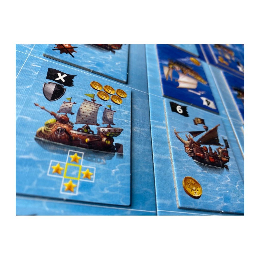 Lorsque vous jouez l’action principale, c’est à dire poser une tuile, vous devez la placer sur une case accessible, soit sur la première ligne de votre plateau, soit sur une case adjacente à un de vos propres bateaux, soit sur un bateau en feu (un des vôtres ou un adverse). Une fois le bateau posée, vous allez déclencher les effets de l’emplacement où est posée votre bateau, et l’effet de votre bateau. Les effets sont divers, il est possible  de recevoir des points de victoire, de tirer orthogonalement ou diagonalement, de réparer un bateau en feu, de placer des mines, de recevoir des pièces, des boucliers…