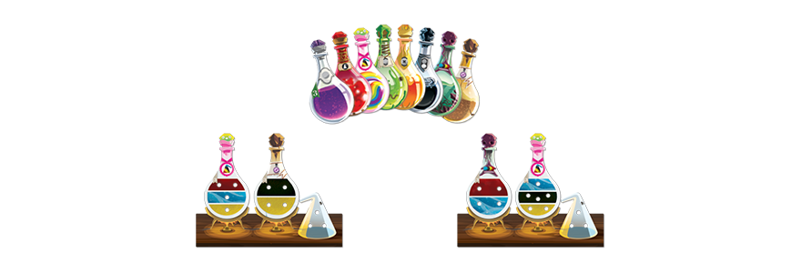 Chaque joueur a devant lui 2 tuiles potion, et ces tuiles ont besoin d’un certain nombre d’ingrédient de différentes couleurs. Donc dès que vous prenez des billes, vous pouvez les placer sur les tuiles potion, et dès qu’une potion est terminée, vous la mettez de coté, vous en prenez une autre. Les potions rapportent des points de victoire, et il y a 8 sortes de potions différentes, donc 8 effets différents. Une fois qu’une potion est terminée, il est possible de la boire pour en utiliser son effet, certains effets permettent de changer la couleur des billes, de voler des billes à vos adversaires, de prendre des billes de même couleur dans le distributeur …