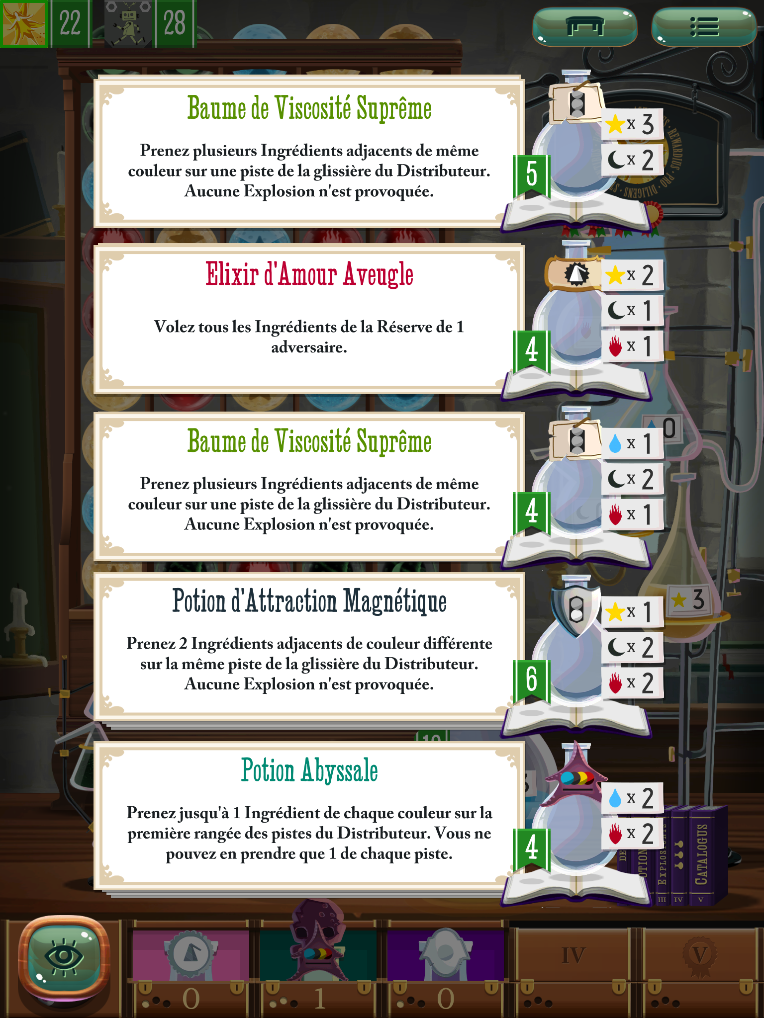 Pour ce qui est du jeu en lui même, c’est du tout bon, tout est très intuitif, on peut consulter les potions disponibles, histoire de savoir ce que l’on garde en réserve, tout se fait très facilement. En terme de sensation de jeu, on retrouve tout le plaisirs du jeu de plateau, sans le plaisir de prendre physiquement une billes et de les entendre s’entrechoquer, mais sinon tout y est, la jubilation de réussir à prendre 15 bille en un seul coup, finir ses 2 potions en lors du même tour …