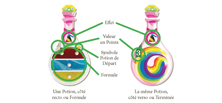 Chaque joueur a devant lui 2 tuiles potion, et ces tuiles ont besoin d’un certain nombre d’ingrédients de différentes couleurs. Donc dès que vous prenez des billes, vous pouvez les placer sur les tuiles potion, et dès qu’une potion est terminée, vous la mettez de coté, vous en prenez une autre. Les potions rapportent des points de victoire, et il y a 8 sortes de potions différentes, donc 8 effets différents. Une fois qu’une potion est terminée, il est possible de la boire pour en utiliser son effet, certains effets permettent de changer la couleur des billes, de voler des billes à vos adversaires, de prendre des billes de même couleur dans le distributeur …