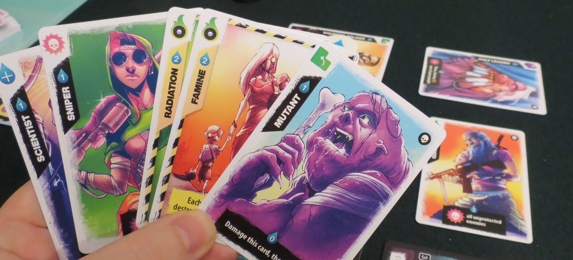 Radlands est un pur jeu d’affrontement dans un univers très déjanté, si vous êtes allergique aux couleurs flashy passez votre tour car vous allez avoir mal aux yeux. Le maître mot ici c’est l’optimisation et aussi un poil de hasard, car un mauvais tirage de cartes peut vous pourrir une partie, mais c’est pas grave on en refait une autre juste derrière !!