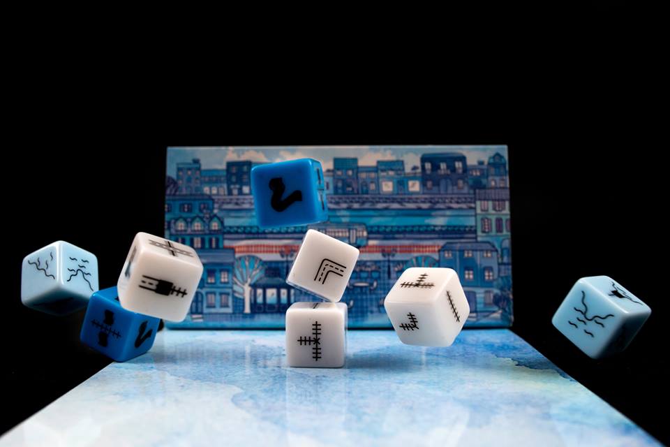 Railroad Ink est une petite boite aux illustrations plutôt sympathique, il faut dire pour le reste du matériel, il n’y a pas d’illustrations, ces illustrations sont signées Marta Tranquilli. A l’intérieur d’une boite de Railroad Ink, on trouve 6 plateaux de jeu, 6 feutres et 8 dés. ci pas de bloc de papier mais des plateaux de jeu effaçable, et ça c’est plutôt une bonne idée.