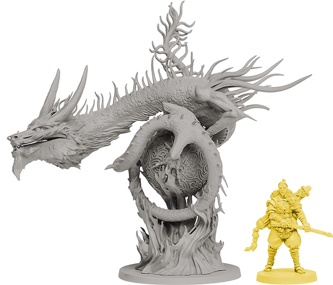Comme je l’ai dit déjà plus haut, c’est une très grosse boite, donc forcement ça annonce souvent du très lourd, nous avons dans cette boite, un énorme plateau de jeu, 5 paravents de Clan, plus d’une quarantaine de tuiles, plus de 60 cartes, des pions, des pièces en plastique, et des figurines ! 58 figurines dans cette boite, c’est pas énorme me direz vous, non c’est clair, mais la qualité des figurines est assez exceptionnelle, elles sont ultra détaillées, et les figurines monstres sont absolument énorme, Blood Rage avait placé la barre très haute, mais là on est encore un cran au dessus, c’est juste magnifique. Bon les illustrations sont signées Adrian Smith, un illustrateur qui a beaucoup bossé pour Game Workshop, donc forcement on a pas affaire à un petit joueur, c’est d’une beauté sans nom.