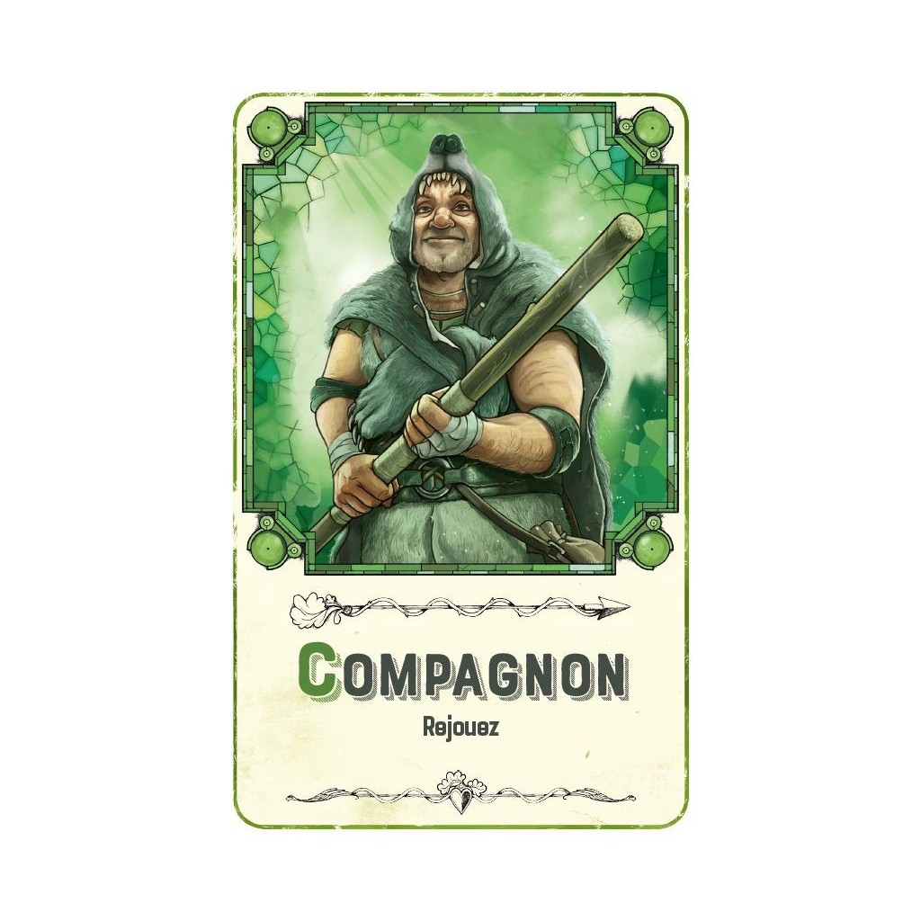 Comme je le disais Robin Wood tient dans une petite boite, car oui le jeu contient 13 cartes, pas une de plus, avec 4 aides de jeu, et c’est tout. Les cartes sont de bonne qualité et les illustrations sont juste superbes, Goupil a fait un travail d’orfèvre avec des cartes personnage qui ont de la gueule sur fond de vitrail, c’est vraiment très jolie, donc merci Goupil.