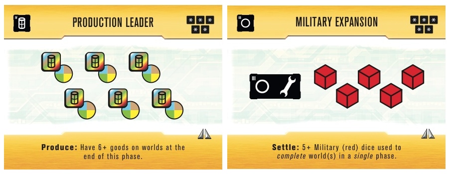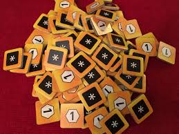 La grosse nouveauté qui est facultative, ce sont les tuiles objectif. En début de partie, 6 tuiles objectif vont être piochées et révélées. Ces tuiles indiquent à quel moment cet objectif peut être revendiqué, la condition pour le revendiquer (avoir un certain nombre de dé dans son gobelet, avoir un certain nombre de crédit …), et le gain de cet objectif. Les objectifs nous permettent de gagner des pions étoile, et ces pions étoile peuvent être utilisés de 2 manières différentes. Si vous avez toujours ces pions étoile en fin de partie, ils sont automatiquement convertis en points de victoire, mais ils peuvent être également défaussés en remplacement d’un dé, ce qui est très très pratique.