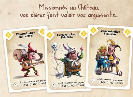 - Placer ses Sbires : en commençant par le premier joueur, chacun va placer un Sbire sur 1 des 5 lieux, et va y piocher une carte. Chaque lieu a sa spécificité, il y a la Taverne (des cartes pour faire des coups bas), le Château (qui permet de gagner des points de victoire), la Grand-Place (qui permet de déclencher des duels et d’autres avantages), l’Église (qui permet d’améliorer ses actions) et la Salle d’Armes (pour s’équiper pour les duels). Il y a une limite sur chaque de placement sur chaque lieu, et elle est variable selon le nombre de joueur.
