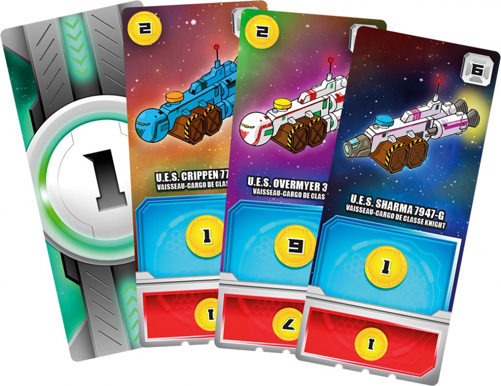 A votre tour, vous allez lancer les 2 dés, et vous pouvez utiliser les 2 dés indépendamment, donc activer 2 cartes, ou utiliser la somme pour activer une carte, à vous de voir ce qui est le plus intéressant. Durant votre tour, vous allez pouvoir activer certaines de vos capacités si vous en avez, et bien sur recevoir les bénéfices des cartes que vous avez activées avec vos dés. Ensuite si vous le souhaitez, vous pouvez acheter une carte, un nouveau vaisseau. Chaque vaisseau a donc un coût en crédit, un effet et un numéro de secteur. Si vous achetez une carte indiquant le secteur 6, cette carte prendra la place du vaisseau qui est deja en secteur 6, et l’ancien vaisseau sera placé sous votre console au niveau sur secteur 6, ce qui laissera dépasser la partie rouge de la carte.
