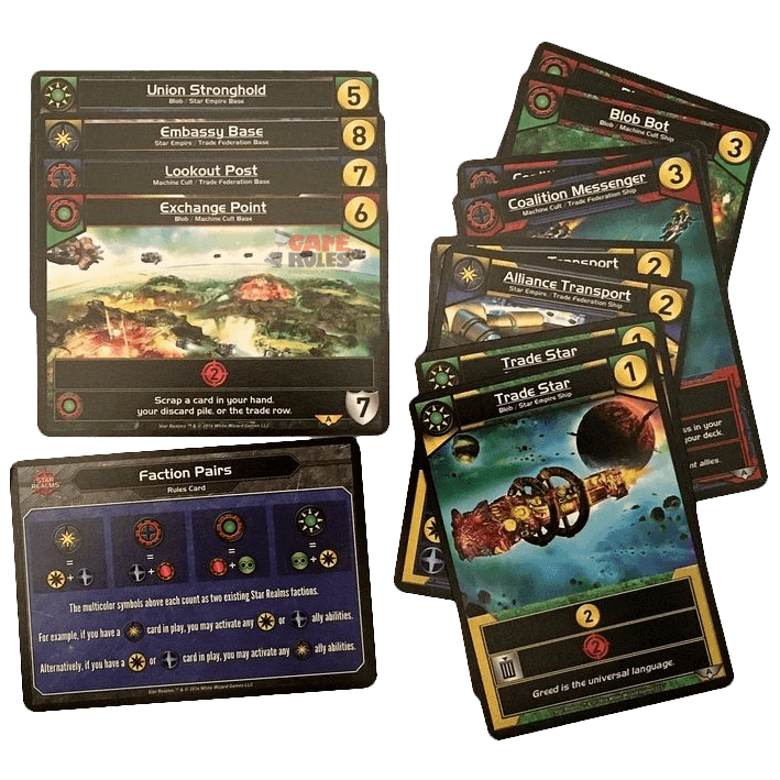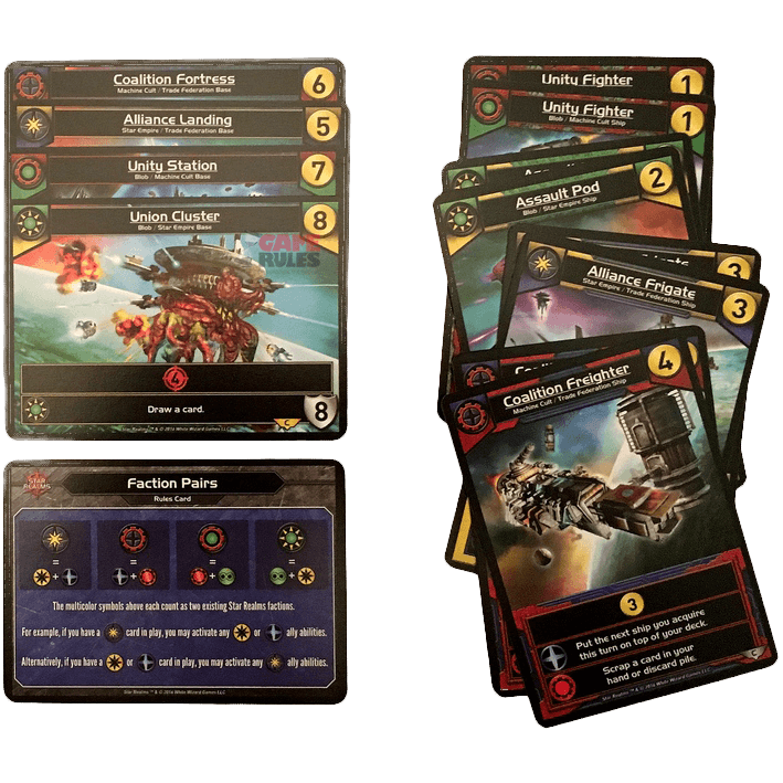 - Le booster Assaut et Commandement : ils introduisent de nouveaux vaisseaux et bases, qui ont pour particularité d’appartenir à 2 factions, ce qui permet de réaliser des combos plus facilement.